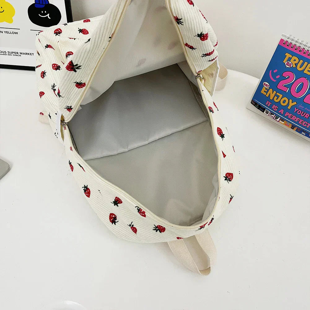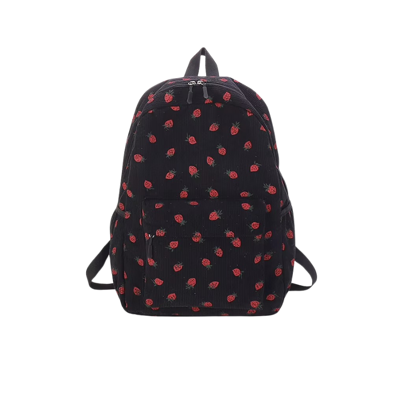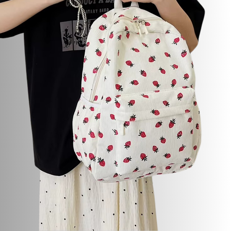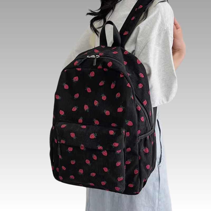 Laat je dagelijkse stijl stralen met de speelse en praktische Genni rugzak. Deze vrolijke backpack is gemaakt van zachte corduroy stof en versierd met een all-over aardbei-print, waardoor hij direct opvalt. De tas biedt een perfecte balans tussen functionaliteit en fashion en is ideaal voor school, werk of daguitstapjes. Dankzij het ruime hoofdvak, voorvak met ritssluiting en de handige zijvakken heb je al je essentials altijd binnen handbereik.