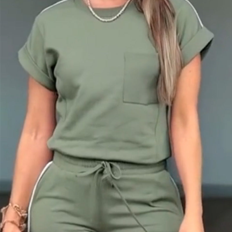 VEELZIJDIGE & STIJLVOLLE DETAILS - Top met korte mouwen, een voorzak en opgerolde manchetten, gecombineerd met een strakke joggingbroek voor een moeiteloze stijl.